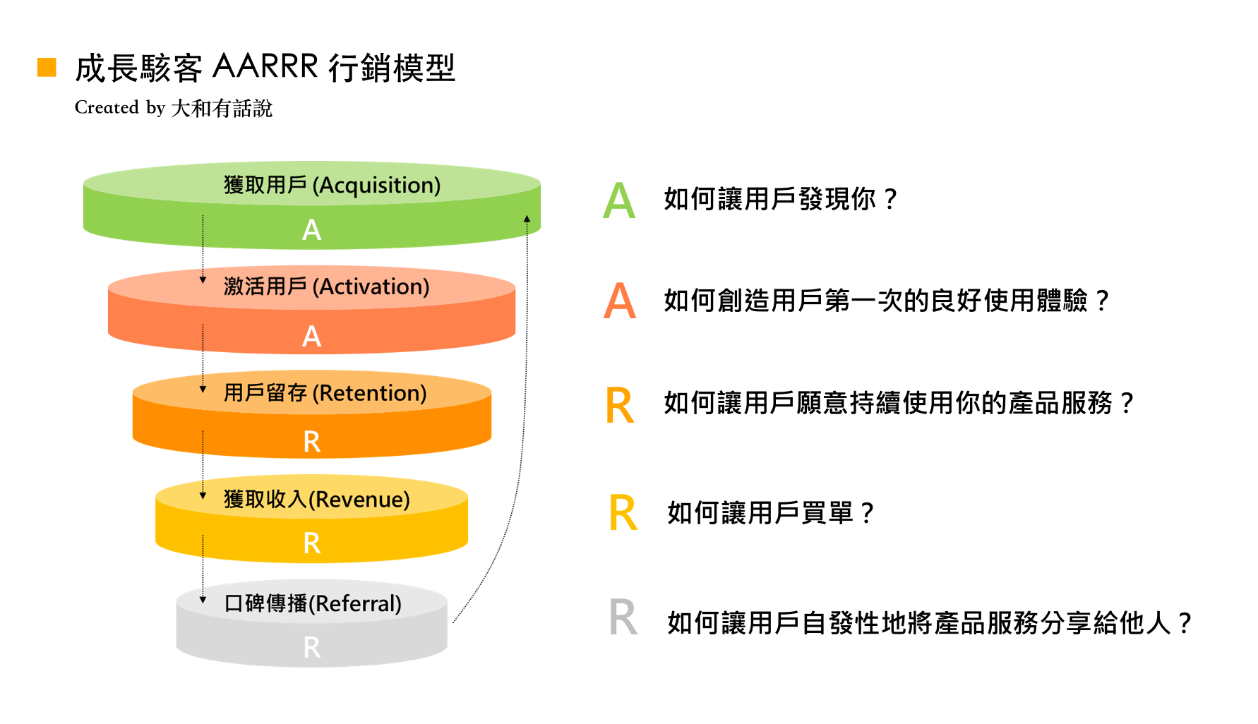 這就有點像是近年興起的成長駭客AARRR模型,從一開始的獲取用戶(Acquisition)、提高活躍度(Activation)、提高留存率(Retention)、流量變現(Revenue),到最後的口碑傳播(Refer),好去吸引新一批的用戶。