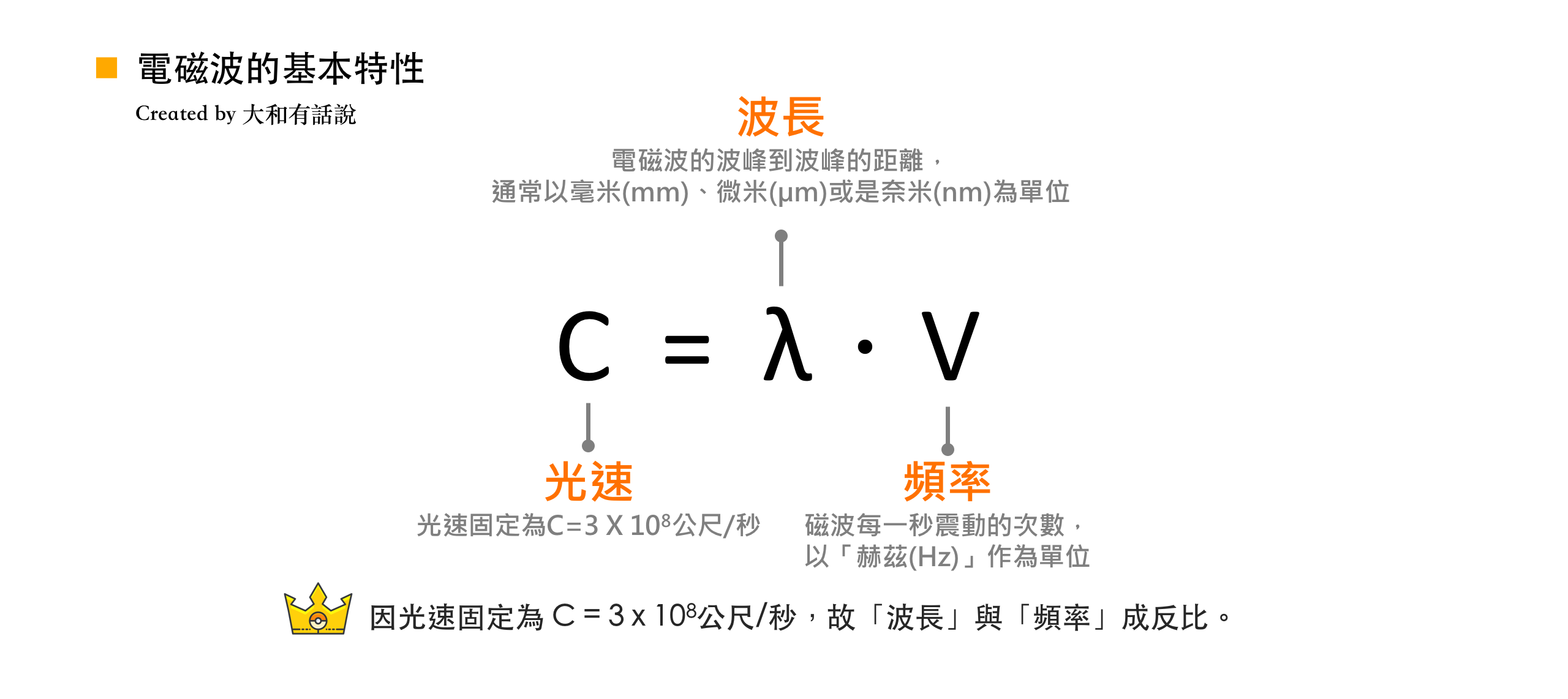 談5G之前,我們先從一個基礎的電磁波原理說起,也就是:光速=波長 X 頻率。當光速固定在每秒30萬公里時,波長愈長,每秒震動的次數也就愈少。換言之,電磁波的「波長」與「頻率」是互為反比的。