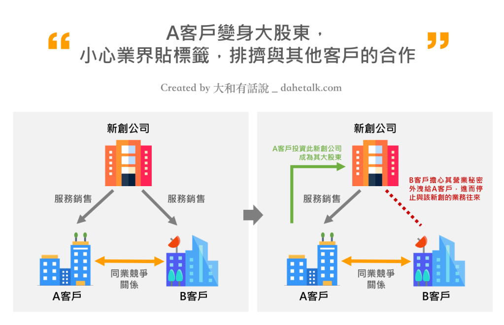 舉例來說,假設某新創公司原有A、B兩家客戶,但A、B兩家客戶在業界互為死對頭。一旦A客戶成為該新創公司的大股東,那麼B客戶為了防止新創洩漏營業秘密給A客戶,就很可能停止與該新創合作。