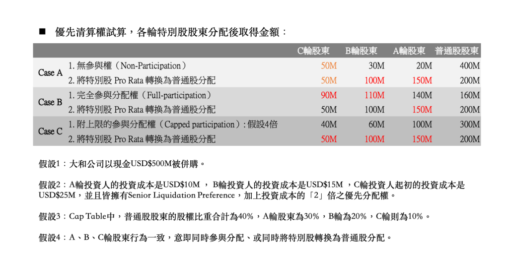 我們延續大和公司的例子,假設A、B、C輪特別股股東皆擁有Capped participation的權利,惟分配金額不得超過原始投資成本的4倍。