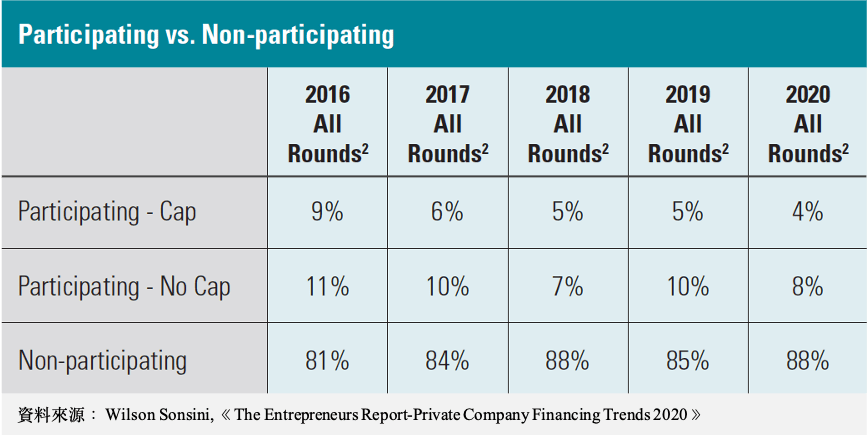 根據美國律師事務所Wilson Sonsini所發佈的《The Entrepreneurs Report-Private Company Financing Trends 2020》,在其服務的新創公司裡,無參與權(Non-Participation)比重最高,其次依序為附上限的參與分配權(Capped participation)、完全參與分配權(Full-participation)。