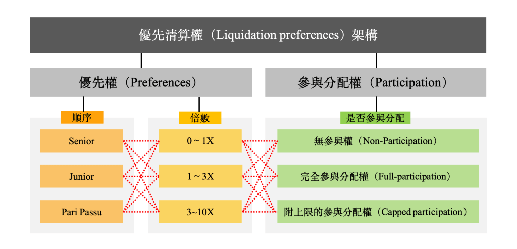 一般來說,「優先清算權」由兩個部分所組成,分別是「優先權(Preference)」與「參與分配權(Participation)」,以下我們分別就兩者來討論:
