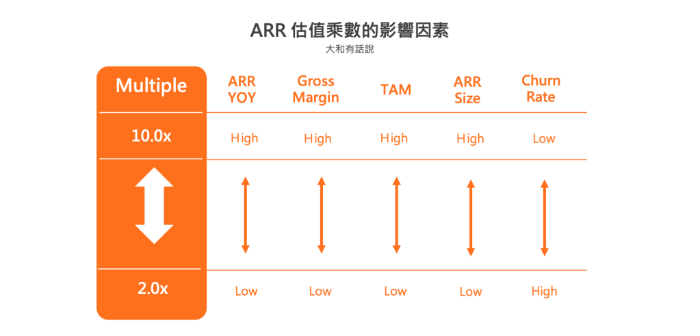 當然,除了ARR成長率外,就我個人的經驗,毛利率的高低對於估值乘數也有一定程度的正相關,其他諸如企業營收規模、潛在市場規模(TAM;Total Addressable Market)、影響ARR的客戶流失率(Churn rate)、客戶生命週期價值(LTV;Lifetime Value)、客戶獲取成本(CAC;Customer Acquisition Cost)也都具有一定的參考價值。
