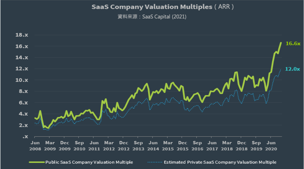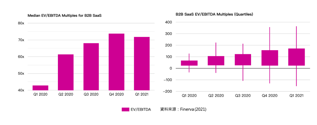 問公司Finerva在2021年也針對B2B SaaS行業發佈了估值倍數的趨勢報告,裡頭統計了包含資安、支付、人資管理、AI等領域的53家B2B SaaS上市公司的EV/EBITDA趨勢,該數據的中位數在疫情下自2020 年Q1的42 倍躍升至2021年Q1的71 倍。可惜的是,這邊並沒有統計未上市公司的部分,不過我們還是可以自行用流動性折價30%去推算。