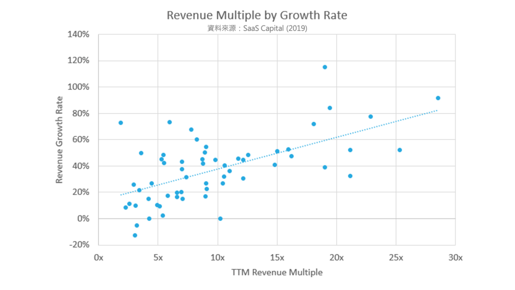 在同個產業內,有些同業的估值乘數高得離譜,但有些則低得可憐,究竟有哪些因子會影響估值乘數的高低呢?SaaS Capital在2019年的一份研究報告指出,「ARR估值乘數」與「ARR的YoY成長率」具有最高度的正相關,且在他們過去12年的經驗下,其他因素都沒有ARR成長率來得顯著。