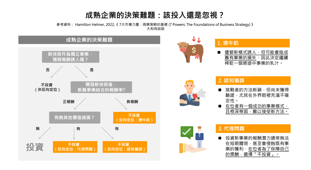 事實上,歷史上那些倒下的巨人大多不是笨蛋。成熟企業的「不反應」往往是深思熟慮的結果。