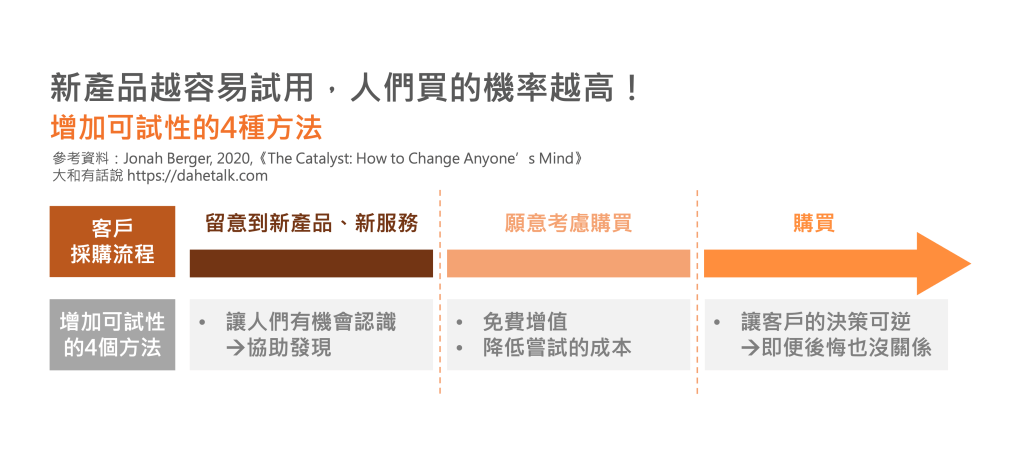 賓州大學華頓商學院的行銷教授Jonah Berger就在其著作《The Catalyst: How to Change Anyone’s Mind》中,提出4項賣家增加「可試性」(Trialability)的行動指南,分別是「讓人們有機會認識」、「善用免費增值模式」、「降低嘗試的成本」以及「讓客戶的決策可逆」。