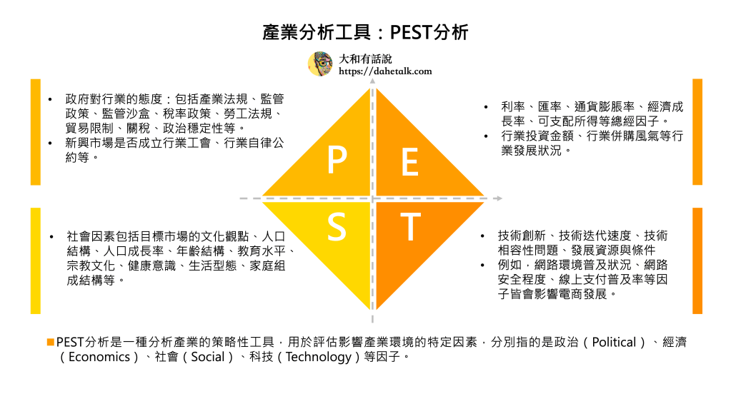P(Political)指的是政府對行業的態度,包括監管法規、貿易政策、稅率政策、政治穩定性等等。E(Economics)是指包括利率、匯率、經濟成長、通貨膨脹率、失業率等經濟因素。S(Social)著重於社會與文化因素,包括人口結構、生活方式、教育水平、健康意識、文化等等。最後則是T(Technology),會考慮到技術的創新、迭代速度、相容性、發展瓶頸等等。