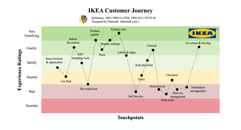 IKEA也是峰終理論的另一個經典案例。若攤開整個IKEA店內的顧客旅程地圖,會發現儘管顧客對「自助服務」、「排隊結帳」、「繞來繞去的路線」不甚滿意,但「產品試用」、「從展間獲得靈感」卻也為顧客創造出滿意的峰值體驗,甚至逛完後還有便宜的熱狗、冰淇淋可以享用。